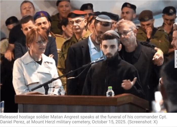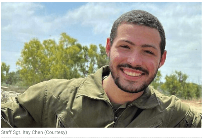 Gestern gab die Hamas eine weitere tote Geisel an Israel zurück. Staff Sgt. Itay Chen, 19, s’’l. Chen war gemeinsam mit Sgt. Omer Leibovitz und Cpt. Daniel Perez, s’’l, in ihrem Panzer ermordet und nach Gaza verschleppt worden. Der einzige Überlebende dieses tödlichen Vorfalls war Matan Angrest, der im vergangenen Monat von der Hamas freigelassen wurde. Auch heute Abend soll eine weitere tote Geisel nach Israel zurückkommen. Sie wurde angeblich in Shejaiya, also im von der IDF kontrollierten Teil der Stadt geborgen.