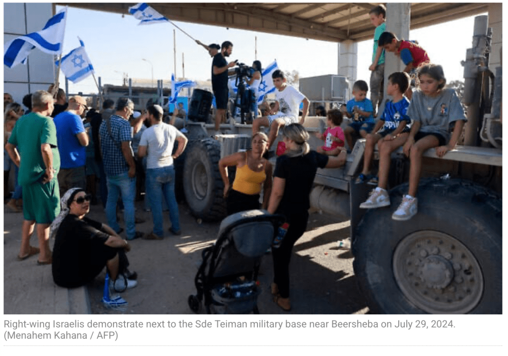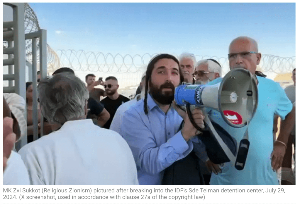 Am 29. Juli werden neun Reservisten von der Militärpolizei festgenommen. Rechte Politiker, darunter Mitglieder der Regierung, versuchen, die Verhaftung zu verhindern. Auch Netanyahu kritisiert das Vorgehen der militärischen GStA Yifat Tomer Yerushalmi. Ben-Gvir fordert sie gar auf «die Hände von den Soldaten zu lassen.» Am 6. August veröffentlicht Kanal 12 das fragliche Video.