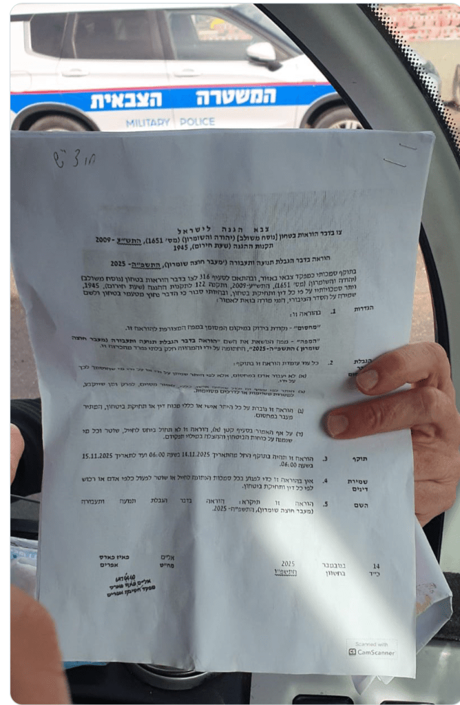 Die IDF erklärte ein Gebiet zur geschlossenen Militärzone, bevor Hunderte von Erntehelfern kommen konnten, um den Palästinensern bei der Olivenernte zu helfen. Es handelt sich um ein Gebiet in der Nähe von Burin bei Nablus. Bei den Helfern handelt es sich u.a. um Mitglieder von ‘Peace Now’, ‘Rabbis for Human Rights’ und ‘Breaking the silence». Die Aktivisten der eher linken NGOs reisten mit sieben Bussen an, wurden an verschiedenen Militärkontrollpunkten gestoppt und an der Weiterfahrt gehindert. Auch die Palästinenser durften ihre eigenen Olivenhaine nicht betreten. MK Gilad Kariv, der sich in einem der Busse befand, erklärte einem Polizisten: «Das Anhalten der Busse erfolgte willkürlich und mit dem klaren Ziel, legitime politische Aktionen zu verhindern. Deshalb möchte ich klarstellen: Der Kommandant der Polizeistation in Ariel weigert sich, das Genehmigungsschreiben der Armee vorzulegen, das ihn zu dieser Entscheidung berechtigt.» Von der IDF gab es bisher noch keine Kommentare.