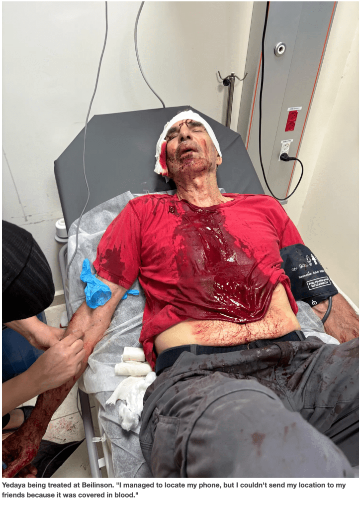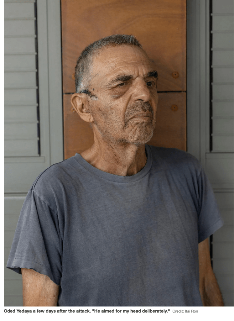 Oded Yedaya, Künstler und politischer Aktivist wurde von einem Stein am Kopf getroffen. Nein, es war kein Araber, der ihn absichtlich schwer am Kopf verletzte, es war ein jüdischer Siedler-Terrorist. «Wenn der Stein ihn nur ein wenig höher oder von hinten getroffen hätte, hätte er ihn getötet», sagt seine Frau Ronit. Yedaya ist überzeugt, dass der Angreifer ihn töten oder zumindest schwer verletzen wollte. «Der erste Stein traf mich am Gesäss, aber dann warf er erneut, sah, dass er mich getroffen hatte, und rannte davon. Er trug eine Kapuze, daher weiss ich nicht, wer er war. Aber ja – definitiv – der Moment, in dem Siedler versuchen, Juden zu töten, ist vielleicht gekommen. Wir sagen schon seit langem, dass es dazu kommen würde.» Yedaya wurde von einem palästinensischen Auto zu einer Klinik gebracht. An den Gesichtern sah er, wie schwer er verletzt war, er selbst wusste es zu dem Zeitpunkt noch nicht. Er verlor viel Blut, erst nachdem er genäht worden war, konnte die Blutung gestoppt werden. Als es zu dem Vorfall kam, hatte er sich von der Gruppe der anderen Demonstranten entfernt, er hoffte auf gute Bilder. Heute ist er sicher, er konnte nur deshalb so präzise getroffen werden, weil er alleine stand. Früher beim Militär unterstand er Yonathan Netanyahu, Benjamin N. war während der Zeit im Militär sein guter Freund. Jetzt stehen sie auf verschiedenen Seiten. Seit vielen Jahren ist er politischer Aktivist in Judäa und Samaria und versucht, jede Demonstration zu dokumentieren. Diese Verletzung ist wohl seine bisher schwerste, aber nicht die erste. Siedler haben ihn schon einmal mit gezielten Stockschlägen angegriffen und mehrfach seine Kamera zerstört. Diesmal kamen die Siedler-Terroristen aus einem Aussenposten mit Namen ‘Mavaser Shalom – Herold des Friedens’. Yedaya erzählt: «Die Lage hat sich in den letzten Jahren stark verschlechtert. Die Zahl der Aussenposten ist gewachsen, und die Siedler haben praktisch die Erlaubnis erhalten, Gewalt anzuwenden; die Armee greift immer seltener ein. Sie haben Geländefahrzeuge und können jedes palästinensische Haus betreten. Sie wollen die Palästinenser vertreiben und ihr Land einnehmen. Sie nehmen vor allem kleine Dörfer ins Visier und zwingen die Bewohner zur Flucht. Sie wollen, dass ganz Beita und alle Olivenhaine ihnen gehören, weil sie glauben, dass „Gott sie uns gegeben hat“. Sie glauben, dass sie das Recht haben, zu schlagen und zu töten. Dieses Mal sind sie ihrem Ziel sehr nahegekommen.»
