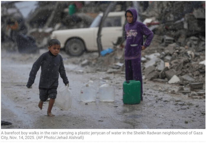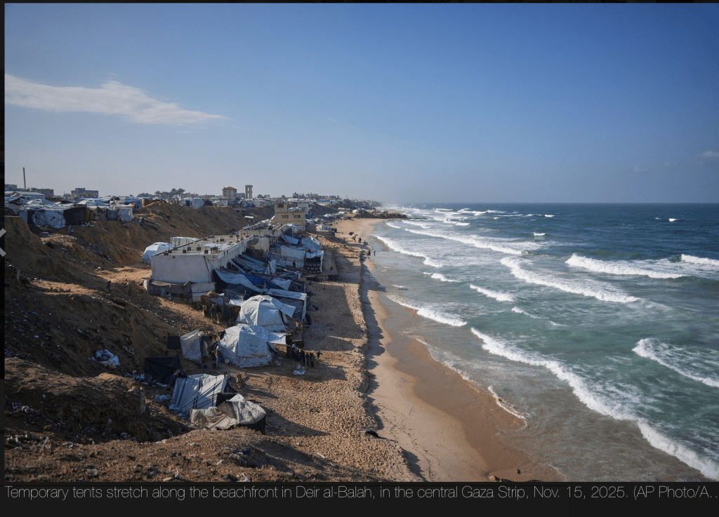 Der erste heftige Wintersturm hat heute auch Gaza erreicht. Die Zelte, die unterhalb der Steilküste in der Nähe der Wasserlinie aufgestellt sind, wurden von den hoch aufgehäuften Wellen teilweise oder auch ganz geflutet. Einige der nur unzulänglichen Zeltdächer wurden vom Sturm zerrissen. Auch in den als Provisorium gedachten Zeltstädten in der Mawasi Region entlang der Küste mussten die durch Sturm und Regen entstandenen Schäden, so gut es ging, beseitigt werden. Die UNO und Israel beschuldigten sich gegenseitig, vorhandene Hilfsgüter nicht in den Gazastreifen zu bringen. Der Sprecher von COGAT betonte jedoch: «Wir haben am Donnerstag rund 1.000 neue Zelte in Gaza verteilt , sowie Winterkleidung, etwa 7.000 Decken und 15.000 Planen, um uns auf den Winter vorzubereiten.» Von der UNWRA hörte man, es seien genügend Unterkünfte und andere Hilfsgüter vorhanden, die nur darauf warten in den Gazastreifen zu kommen.