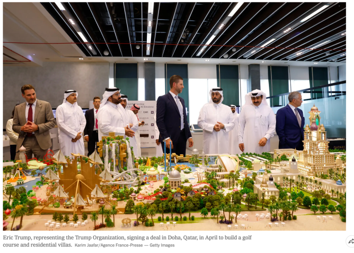 Die Immobilien Pläne betreffen ein US$ 63 Milliarden Projekt, das die saudische Stadt Diriyah in ein Luxus-Resort, ganz nach den Vorstellungen der Resort-affinen Trumps verwandeln soll. Vorgestellt wurde das Projekt während des Besuches von Trump in Riyad. Jerry Inzerillo, langjähriger Freund von Trump und hochrangiges Mitglied im Planungsrat von Diriyah sagte: «Noch ist nichts wirklich spruchreif, aber bald wird es so weit sein. .» Es sei seine Glanzidee gewesen, Trump das Projekt vorzustellen und «er liebte es sofort.» Politik und Geschäftsbeziehungen, das sei die Essenz für Trump und seine Familienmitglieder. Eric, Trump jr. hält sich mit der Beantwortung von Fragen bedeckt. Für Trump, Trump & Kushner Inc. ein tolles Geschäft. Eigentümer der Giga- Projekte ist der Staat SA, für die Amerikaner fielen im vergangenen Jahr US$ 21,9 Millionen Lizenzgebühren ab. Ein Teil davon floss direkt in Trumps Privatschatulle……