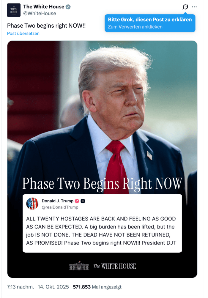 Trump erklärte vor Journalisten im Oval Office, dass«alles sehr gut läuft und wir sehr schnell in Phase zwei der Verhandlungen eintreten werden.» Bereits am 14. Oktober hatte er erklärt, man sei bereits in Phase zwei eingetreten. Gestern musste er sich jedoch korrigieren: «Heute gab es ein Problem mit einer Bombe, die explodierte – einige Menschen wurden schwer verletzt, wahrscheinlich sind auch einige ums Leben gekommen», sagt Trump und bezieht sich dabei auf den gestrigen Anschlag auf israelische Truppen in Gaza [bei dem fünf Soldaten verletzt wurden und zwei der drei Terroristen neutralisiert wurden].«Aber es läuft sehr gut. Wir haben Frieden im Nahen Osten. Die Menschen sind sich dessen nur nicht bewusst.» Trump ist und bleibt eine Plaudertasche. Die einen plaudern aus dem Nähkästchen, die anderen aus dem Golfbag!