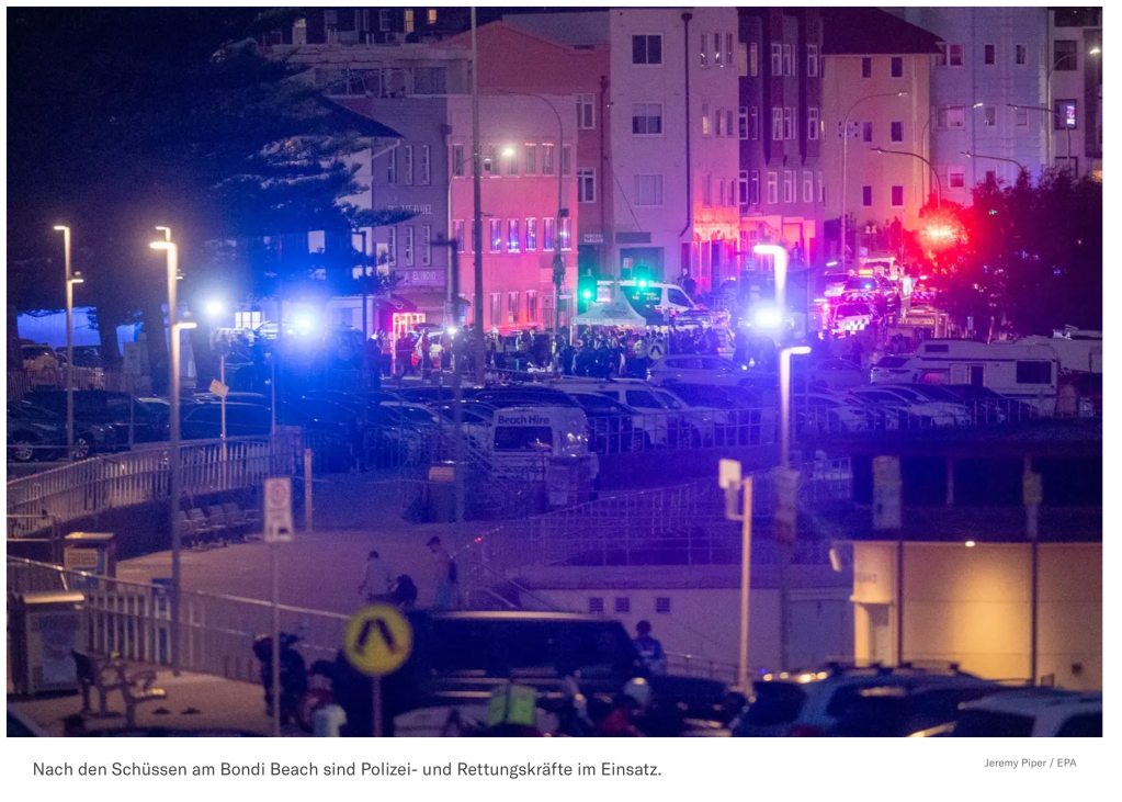 Gestern Abend fanden sich einige Hundert Juden am am ‘Bondi Beach’ in Sydney ein, um die erste Kerze der Chanukkia anzuzünden. Die jüdische Gemeinde hatte für die Veranstaltung geworben. Jeder war herzlich eingeladen, zu kommen. Um 18:45 gingen die ersten Notrufe bei der Polizei ein. Was als fröhliche, friedliche Veranstaltung geplant war, wurde zum tödlichen Desaster.