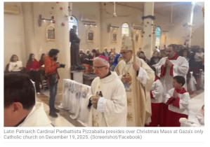 Der lateinische Patriarch von Jerusalem feierte eine Weihnachtsmesse in der einzigen katholischen Kirche in Gaza. Kardinal Pierbattista Pizzaballa absolviert seinen dritten Besuch in der christlichen Enklave seit dem Massaker vom 7. Oktober 2023. Im Juli hatte ein Irrläufer die Kirche getroffen. Dabei wurden drei Menschen getötet und mehrere verletzt.