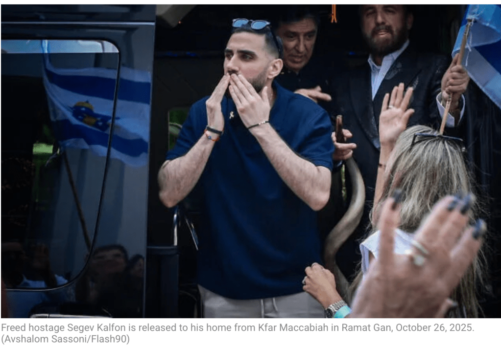 Am 7. Oktober 2023 rannte Segev Kalfon, 27, um sein Leben. Er hatte mit Freunden auf dem Musik-Festival in Re’im getanzt, als das Massaker begann. Augenzeugen berichteten, dass er es schon fast geschafft hätte, auf der anderen Strassenseite in Sicherheit zu sein, als die Hamas-Schlächter ihn entdeckten und ihn nach Gaza verschleppten. Dort litt er bis zum Oktober dieses Jahres, als er zusammen mit den letzten 20 lebenden Geiseln freigelassen wurde. In einem Interview mit ‘Radio Kan’ berichtete er von 738 Tagen in den Händen der Hamas. Immer wieder sei er durch heftigen Beschuss der IDF gefährdet gewesen. «Sie haben mich so oft bombardiert», sagte Kalfon, «dass ich an einen Punkt kam, an dem ich mir sagte: ‚Grossartig, wenn ich nicht durch die Hand der Hamas sterbe, sterbe ich vielleicht durch einen Unfall, durch die Hand meiner eigenen Armee.» Es kam soweit, dass er den Schutz des Tunnel suchte, fast ohne Luft, heiss, feucht und dunkel. Sobald Ben-Gvir stolz berichtete, die Haftbedingungen der palästinensischen Gefangenen wieder verschärft zu haben, nahmen die Strafmassnahmen und die Folter der Hamas-Schlächter zu. Manchmal habe er überlegt, Selbstmord zu begehen. Dann habe er, nach 16 Monaten in Geiselhaft, die Stimme seiner Mutter im Radio gehört. Er hörte, wie sie sich für seine Freilassung einsetzt. Ab dem Zeitpunkt wollte er überleben.