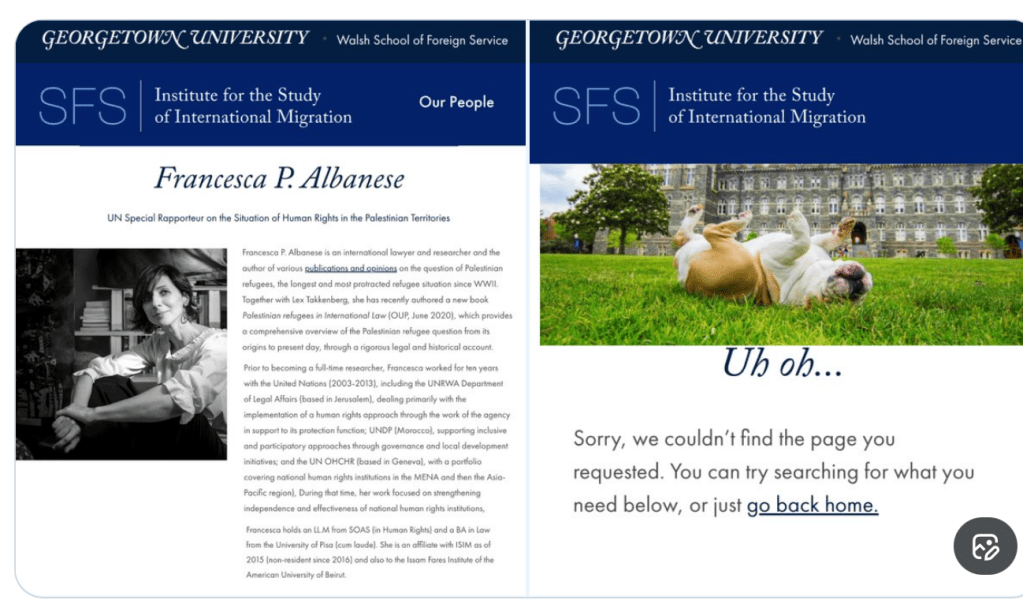 In einem kürzlich geführten Interview machte Albanese die US-Sanktionen für die Entscheidung der Georgetown University verantwortlich, sie zu entlassen. «Das ist ein Verrat! Ich hatte eine Verbindung zu einer US-amerikanischen Universität. Ich habe dort Vorlesungen gehalten. Jetzt ist alles weg.» NEBBICH!!!!!