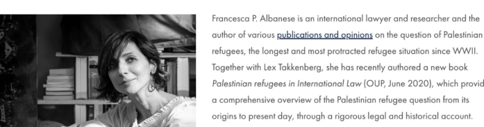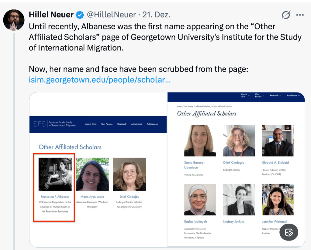 Nota bene: Auf der Textseite wird Albanese als ‘Internationale Rechtsanwältin’ bezeichnet. Sie selbst hat mittleriweile, so Hillel Neuer, zugegeben, dass sie das Studium nie abgeschlossen hat und daher auch über keinerlei Lizenz verfügt!