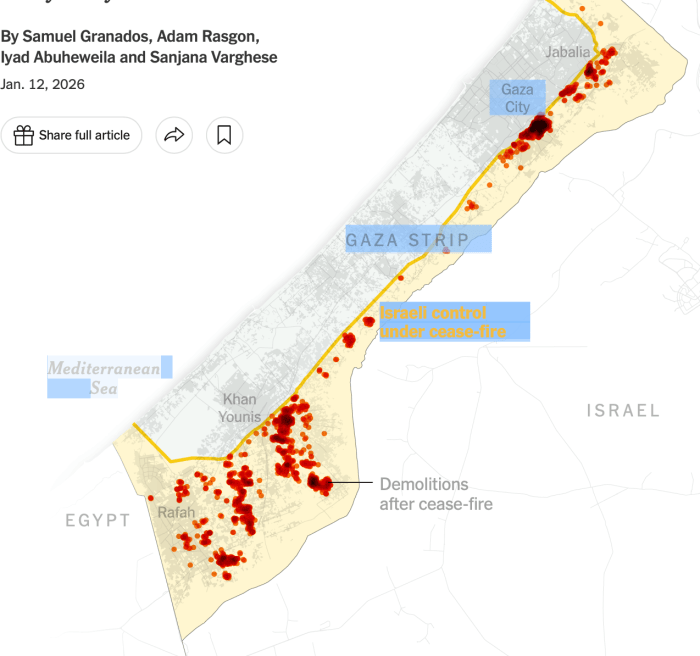 Die IDF hat seit Beginn der Waffenruhe im Oktober 2025 mehr als 2.500 Gebäude in Gaza zerstört. Das berichtet die New York Times unter Berufung auf Satellitenbilder in ihrer heutigen Ausgabe. Der Grossteil der Gebäude befand sich demnach auf der von der IDF kontrollierten Seite des Gazastreifens. Gemäss Aussagen der IDF sind zahlreiche Gebäude zusammengestürzt, als die darunterliegenden Tunnel gesprengt wurden. Shaul Arieli, Kommandant der Gaza-Truppen im Jahr 1990 beklagt: «Das ist keine selektive Zerstörung mehr, das ist einfach nur mehr Zerstörungswut.»