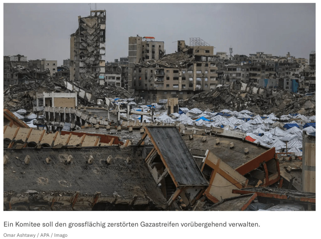 Nach und nach kommen mehr verschwurbelte Informationen aus dem Weissen Haus, wie der Friedensrat, dessen Vorsitzender Trump selbst sein wird, zusammengesetzt ist. Zunächst wurde der ‘Gründungsrat’ vorgestellt: US-Aussenminister Marco Rubio, Steve Witkoff, Jared Kushner, der ehemalige britische PM Tony Blair, Marc Rowan, CEO von Apollo Global Management, Ajay Banga, Präsident der Weltbank und Robert Gabriel, Trumps ehemaliger stv. nationaler Sicherheitsberater. Jedes Mitglied überwacht einen ihm zugeteilten Bereich, um langfristig den Gazastreifen zu stabilisieren. Das zweite Gremium, der ‘Gaza Executive Board’, dessen Aufgabe es sein wird, «eine effektive Regierungsführung und die Bereitstellung erstklassiger Dienstleistungen zu unterstützen, die Frieden, Stabilität und Wohlstand für die Bevölkerung des Gazastreifens fördern.» Die Mitglieder sind: Kushner, Blair, Rowan, der türkische Aussenminister Hakan Fidan, der katarische Diplomat Ali Thawadi, der ägyptische Geheimdienstchef Hassan Rashad, die Ministerin für internationale Zusammenarbeit der Vereinigten Arabischen Emirate, Reem Al-Hashimy, der israelisch-zyprische Geschäftsmann Yakir Gabay, die ehemalige humanitäre Koordinatorin der Vereinten Nationen, Sigrid Kaag, und der ehemalige UN-Sonderbeauftragte für den Nahen Osten, Nickolay Mladenov. Der letztgenannte wird auch der Verbindungsmann zwischen dem Friedensrat und dem Technokraten-Team sein. Weitere Namen sollen folgen. Am Nachmittag sagen Milei (Argentinien) und Carney (Kanada) zu. El-Sissi (Ägypten) wird noch nachdenken.