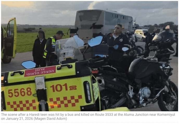 Yitzhak Goldknopf, Vorsitzender der United Torah Judaism, erklärte, dass es für ihn keinen Zweifel gebe, dass der tödliche Unfall, bei dem gestern ein 17-Jähriger von einem Bus angefahren und getötet wurde, vorsätzlich geschah. Er berief sich dabei auf neues Filmmaterial und Aussagen der Fahrgäste. Die Polizei betonte jedoch, dass es zwischen den Videos und dem Unfall keinen Zusammenhang gebe. Er habe, so Goldknopf, mit dem zuständigen Minister Ben-Gvir über den Fall gesprochen. «Minister Ben-Gvir betonte in dem Gespräch, dass ‚das Blut unserer ultraorthodoxen Brüder nicht billig ist», sagt Goldknopf und fordert, dass «der Fahrer, der Fahrerflucht begangen hat, vor Gericht gestellt wird.» Ben-Gvir betonte, «Ich nehme die Angelegenheit sehr ernst. Die israelische Polizei wird ihre Arbeit gewissenhaft erledigen und den Vorfall umfassend untersuchen.» Der Fahrer wurde festgenommen. Ihm werden einige Übertretungen der Strassenverkehrsordnung, sowie fahrlässige Tötung vorgeworfen.