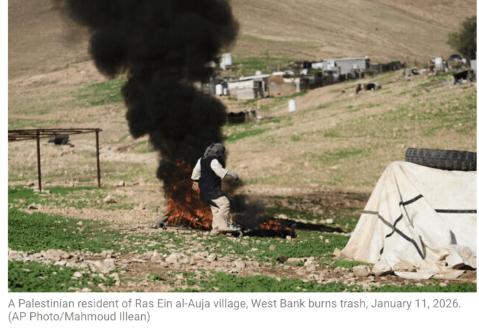15 Familien der Siedlung Ras Ein el-Aija im Jordantal haben heute damit begonnen, ihre Unterkünfte abzubauen und ihre angestammte Gemeinde mit all ihren Habseligkeiten zu verlassen. Seit vor etwa einem Monat jüdische Siedler-Terroristen einen illegalen Aussenposten errichtet hatten, fühlten sich die Beduinen nicht mehr sicher. Die IDF würde über alle Angriffe der jüdischen Siedler-Terroristen hinwegsehen und sie decken. Bereits am 8. Januar verliessen 26 weitere Beduinen ihr Wohngebiet, die ersten zwei Familien waren schon im Sommer fortgezogen. Ursprünglich lebten in dem Gebiet etwa 700 Beduinen aus mehr als 100 Familien, die dort seit Jahrzehnten lebten und Viehzucht betrieben. Laut B’Tselem dringen die Siedler täglich in das Gebiet der Gemeinde ein, stehlen Vieh, zerstören Eigentum und greifen Bewohner an, so die Organisation.