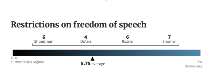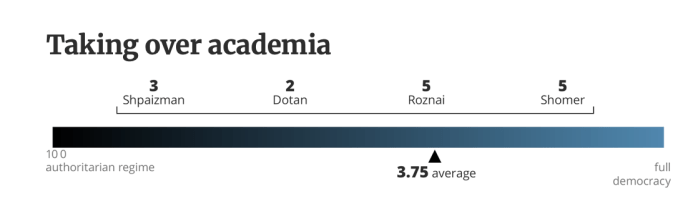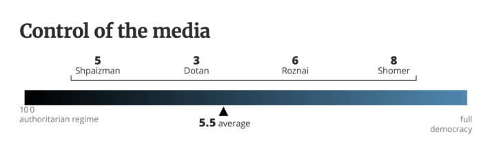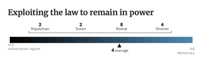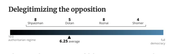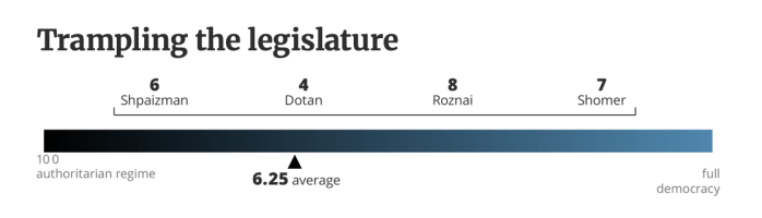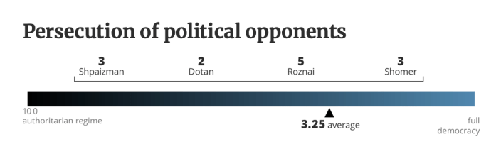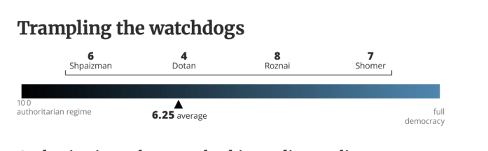 Es ist leider schon lange erkennbar, dass Israel, einst die lebendigste und stabilste Demokratie im Nahen Osten auf dem Weg ist, von Netanyahu und seiner ‘Regierung’ in den politischen Abgrund gerissen zu werden. Diese Regierung war erst wenige Tage alt, nachdem sie am 29. Dezember 2022 vereidigt worden war. Am 4. Januar 2023 kündigte JM Yariv Levin seine umfassenden Pläne zu gewaltsamen Umstrukturierung der Jurisdiktion, eine der drei Säulen der Demokratie an. Von dem Tag an demonstrierten Woche für Woche Hunderttausende in allen grösseren Orten des Landes gegen die Regierung. Durch das Massaker vom 7. Oktober 2023 wurden die Proteste unterbrochen. Kaum wurde der fragile Waffenstillstand am 13. Oktober 2025 verkündet, tauchte Levin mit seinen zerstörerischen Vision wieder auf, die Büchse der Pandora ist wieder offen. Zum Glück ist Israel noch weit von einer ‘vollständigen Autokratie’ entfernt. Vier Politikwissenschaftler der wichtigsten israelischen Universitäten haben Skalen für die wichtigsten Beobachtungspunkte erstellt, die von 1 bis 10 den derzeitigen Standort markieren. Sie hielten fest, dass die Justiz, das von Levin am intensivsten bekämpfte Merkmal der Demokratie, «die meisten Versuche, die Regierungsform zu ändern, sehr effektiv blockiert hat.»