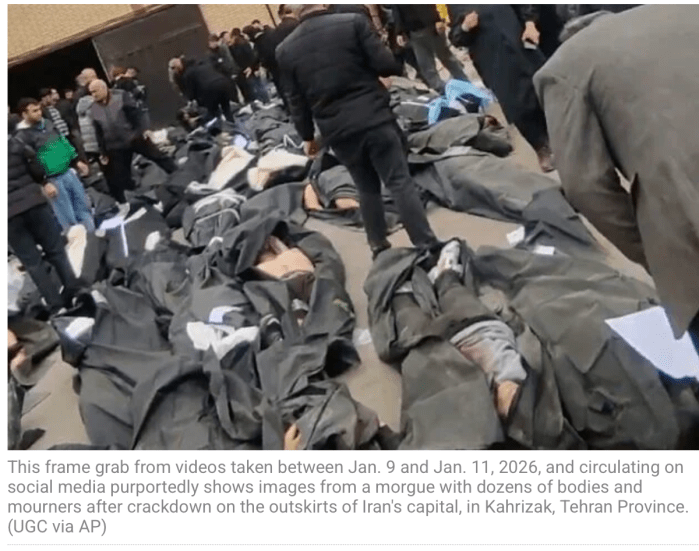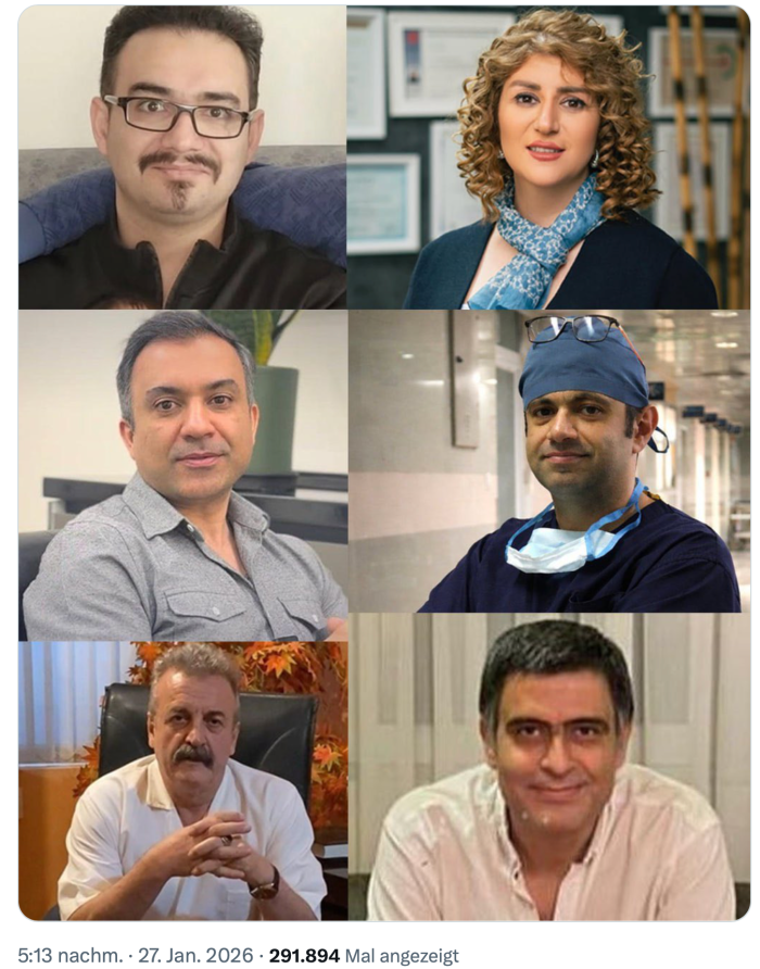 Masih Alinejad, eine Bloggerin aus dem Iran schreibt auf ‘X’: «Das ist Staatsterror. Ich glaube nicht, dass das Regime die anstehenden 800 Exekutionen abgesagt hat, wie Trump behauptet. Im Iran haben die ‘Sicherheitskräfte’ die Spitäler gestürmt, um ihren Job zu beenden. Jetzt stürmen sie die Häuser der Ärzte. Mindestens 40.000 Menschen wurden ermordet, mehr als 300.000 verletzt.