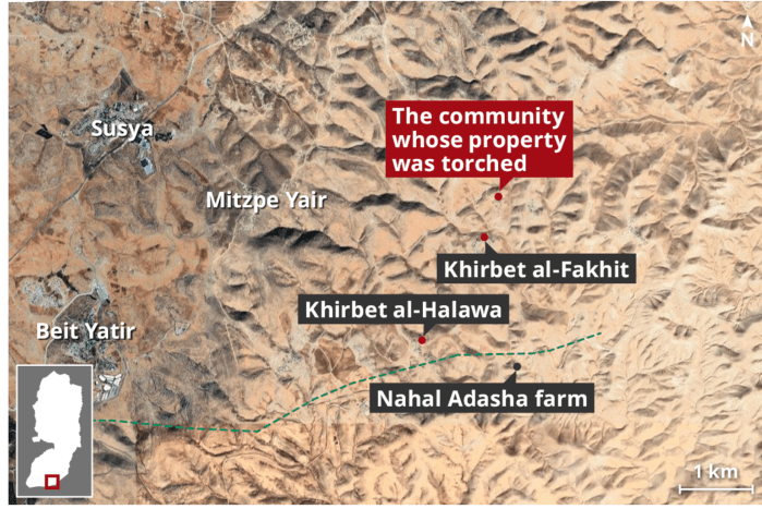 Selbst eine sechsstündige Spur der Verwüstung beginnt mit wenigen Schritten eines einzigen Mannes: den Schritten eines Siedlers von der Nahal Adasha-Farm in das Dorf Khirbet al-Halawa in Masafer Yatta im südlichen Westjordanland. Am Dienstagnachmittag gegen 17 Uhr kehrte der Siedler vom Weiden seiner Herde zurück und passierte dabei das Wadi unterhalb der örtlichen Gemeinde.