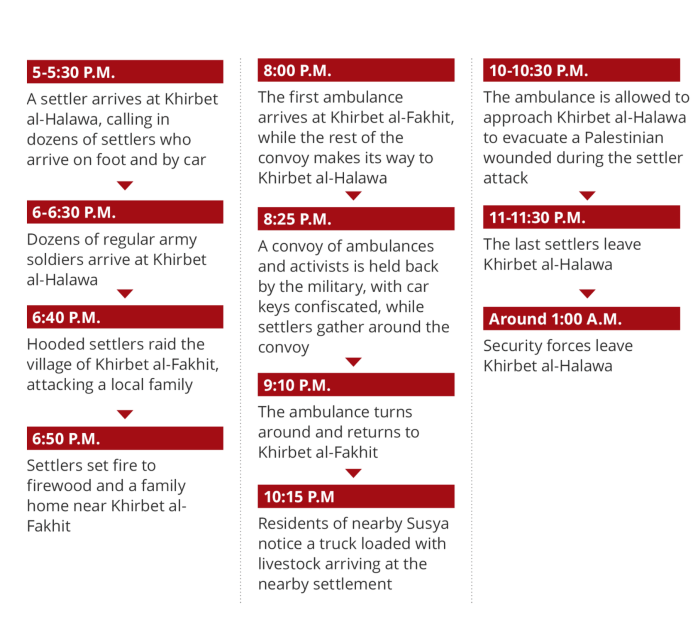 Zur gleichen Zeit trafen Teams des Roten Halbmonds sowie palästinensische und israelische Freiwillige in dem Gebiet ein. Rettungskräfte sagten, Siedler hätten Steine auf den Krankenwagen geworfen, der nach Fakhit unterwegs war. Gegen 20 Uhr evakuierte der Krankenwagen Mohammed und seine Mutter, während andere Krankenwagen in Richtung Halawa fuhren. Um 20:25 Uhr blockierten Soldaten die Rettungskräfte auf dem Weg nach Halawa und beschlagnahmten die Schlüssel der Krankenwagen und der Autos der Freiwilligen. Siedler versammelten sich um die Fahrzeuge, und Videos, die Haaretz vorliegen, zeigen, wie Siedler dreist die Türen der Krankenwagen öffnen.
