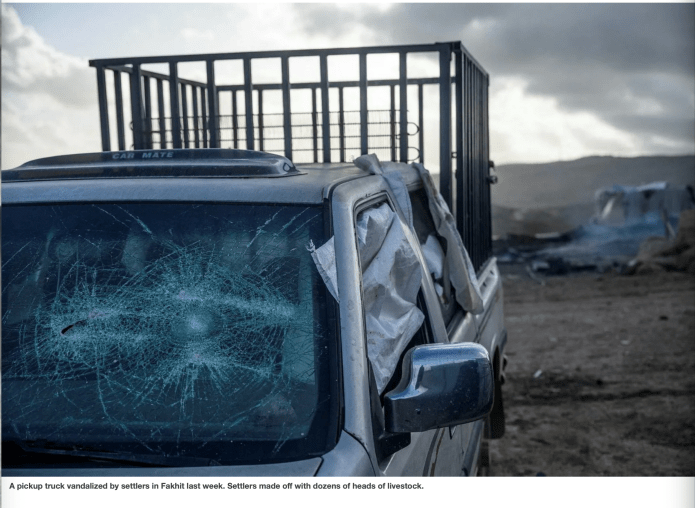 „Ich hörte, wie ein Siedler zu den Soldaten sagte: ‚Wenn ihr mich nicht tun lasst, was ich will, werde ich es ohne euch tun‘“, berichtete ein Bewohner. „Dann öffnete der Soldat, der zunächst versucht hatte, sie am Betreten zu hindern, den Pferch für sie, und der Siedler begann, die besten Schafe auszuwählen. Sie nahmen alle Schafe meines Nachbarn mit.“