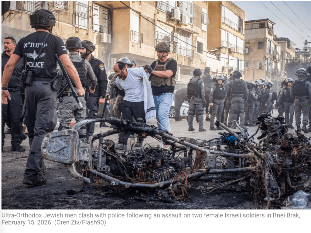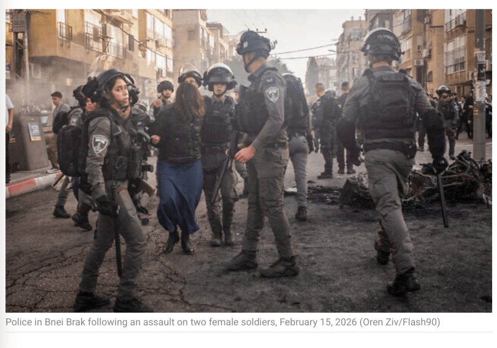 Der brutale haredische Mob hetzte gestern zwei junge Soldatinnen quer durch die Strassen von Bnei Brak. Die beiden mussten sich in Todesangst in einem Müllcontainer verstecken, bis sie von Kollegen gerettet werden konnten. Der Grund, dass die Situation, wie berichtet wurde, von ‘Null auf Hundert’ eskalierte, liegt in der fehlgeleiteten rechten Politik. Um sich selbst politisch an der Macht zu halten, hält Netanyahu seine ultra-religiösen Koalitionspartner immer wieder hin, macht ihnen Zugeständnisse, um sie dann doch wieder zu vertrösten. So wie man dem Esel die Karotte vors Maul hängt, damit er gierig und in der Hoffnung auf Wunsch-Erfüllung ohne nachzudenken weiterläuft.