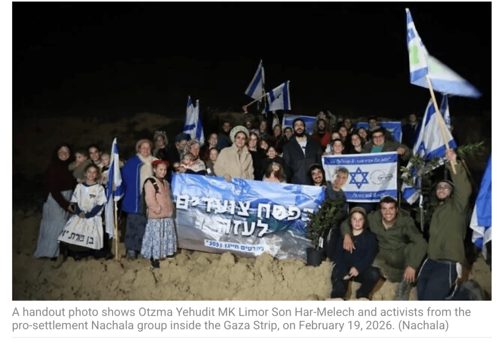 Zum wiederholten Mal hat eine Siedlergruppe, die der Partei Otzma Yehudit nahesteht, illegal den Gazastreifen betreten. Mit dabei war MK Limor Son Har-Melech (im Bild in der Mitte mit heller Jacke). Die IDF verurteilte den Vorfall, von dem sie sagt, dass er sowohl die Aktivisten als auch die Soldaten einem sinnlosen Risiko aussetzt. Immer wieder betreten Siedlergruppen illegal den Gazastreifen, um dort symbolisch mit einer erneuten Besiedlung zu beginnen. Um diesem Anspruch der Neubesiedlung Nachdruck zu verleihen, wurden Bäume gepflanzt. Die Aktivisten wurden von der IDF sicher aus dem Gebiet gebracht und der Polizei zur weiteren Befragung übergeben.