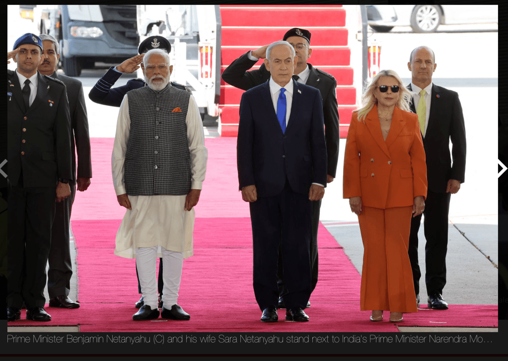 Der PM von Indien Narendra Modi ist am Mittag zu einem zweitägigen Besuch in Tel Aviv eingetroffen. Am Flughafen wurde er von Netanyahu und Amir Ohana. Begleitet wurden sie von ihren Ehepartnern, Sara N. und Alon Hadad.