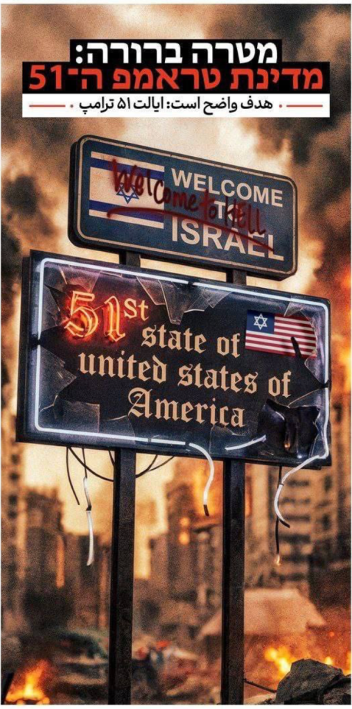 Am Palästina Platz in Teheran sind neue grossflächige Schilder aufgetaucht: «Das Ziel ist klar – Trumps 51. Staat!» Wer glaubt, es handelt sich um den Iran, der täuscht sich. Auf dem nächsten Schild steht neben der Flagge von Israel «Willkommen in Israel». Darüber gepinselt ist: «Willkommen in der Hölle.» Den Abschluss bildet ein scheinbar zerstörtes Schild mit dem Aufdruck: «Der 51. Staat der USA.»