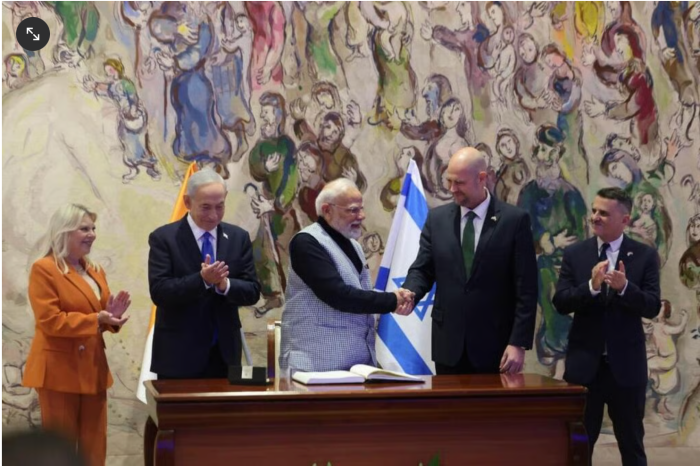 PM Modi betonte, wie gross die Ehre für ihn sei, in der Knesset zu sprechen «als Repräsentant einer alten Zivilisation, die eine andere begrüsst.» Er drückte seine Hoffnung aus, dass gemeinsame Bemühungen, an denen sich auch Indien beteiligt, zu einem dauerhaften Frieden und regionaler Stabilität beitragen werden. Er bringt Indiens Zustimmung zum umfassenden Friedensplan der Trump-Regierung für den Gazastreifen zum Ausdruck und sagt: „Wir glauben, dass er die Aussicht auf einen gerechten und dauerhaften Frieden für alle Menschen in der Region bietet, auch durch die Lösung der Palästina-Frage.»