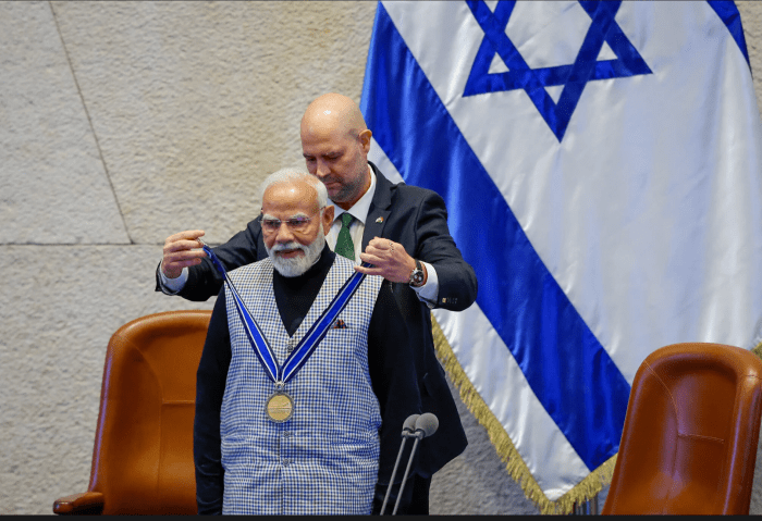 Nach seiner Rede erhielt PM Modi von Knesset-Sprecher Ohana die neu kreierte Medaille der Knesset ‚für dessen bedeutende Verdienste um den Staat Israel und das jüdische Volk’. „Die Verleihung dieser Auszeichnung an PM Modi ist Ausdruck unserer tiefen Anerkennung für seine Bemühungen um den Aufbau einer strategischen Allianz zwischen Israel und Indien. Seine Politik ist Ausdruck einer mutigen, konsequenten und aufrichtigen Freundschaft mit dem Staat Israel und eines festen Beistands an seiner Seite, selbst in komplexen und herausfordernden Zeiten.“
