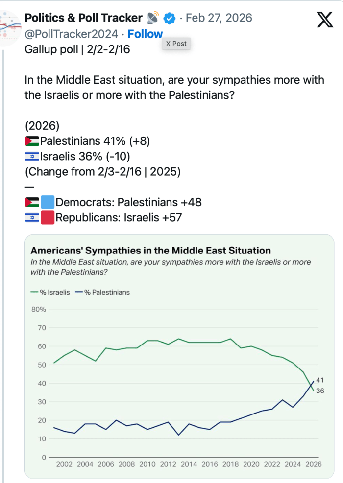 Erstmals seit Jahrzehnten ist laut einer Umfrage des Gallup-Instituts der Sympathiewert der Amerikaner für die Palästinenser höher als für Israel. Die Frage «Haben Sie in der Nahost-Konfliktlage mehr Sympathie für die Israelis oder für die Palästinenser?» beantworteten 36 % der Befragten mit Israel, während 41 % mehr Sympathie für die Palästinenser empfinden. Im vergangenen Jahr lagen die Umfragewerte noch bei 46 % für Israel und 33 % für Palästina. Nur die Altersgruppe der über 55-jährigen bevorzugt die Israels, während die 18- bis 24-jährigen und die 35- bis 54-jährigen die Palästinenser unterstützen. Schuld daran ist einzig und allein Netanyahu und seine unfähige ‘Nicht-Regierung’.