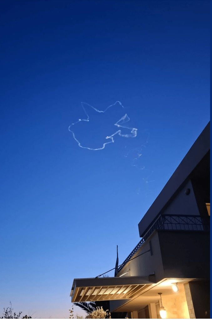 So sah das ‘Bild’ einer abgefangenen Rakete über unserem ersten Haus in Zichron Yaakov aus……. Danke Gabi, tolles Bild!