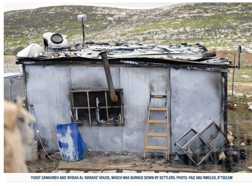 Die Dörfer liegen innerhalb der E-1 Zone, die nach dem Willen von Smotrich bald schon ein weiterer Teil auf dem Weg zu ‘Gross-Israel’ werden soll und eine Zwei-Staaten-Lösung verhindert. Im Oktober legten die jüdischen Siedler-Terroristen Feuer an einige der Behausungen. Bevor sie sich wieder davon machten, stahlen sie noch einige Wassertanks.