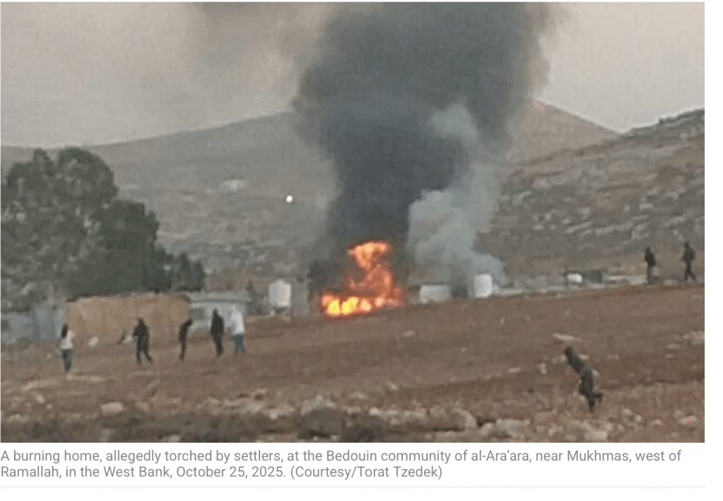Das Leben in Khallet a-Sidra, einer der Beduinen-Siedlungen nord-östlich von Jerusalem, ist seit der Amtsübernahme der jetzigen ‘Nicht-Regierung’ Ende Dezember 2022 anders geworden. Nicht mehr ruhig und beschaulich, wenn es auch nie leicht war. Seit damals hat die Gewalt der Siedler gegen sie andauernd zugenommen. Eine Familie nach der anderen gab auf und zog weiter. Der Grund war eine Welle der Gewalt, die im Oktober 2025 über sie hereinbrach.