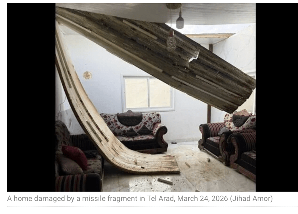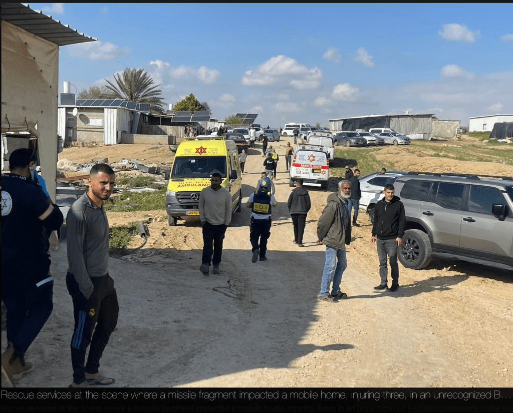 Raketentrümmer einer abgefangenen iranischen Rakete trafen in Tel Arad, einem illegalen Beduinen-Dorf im Negev, auf ein Haus und richteten dort erheblichen Schaden an. Die Eigentümer des Hauses befanden sich im eigenen Schutzraum, sodass sie den Angriff unverletzt überlebten. Das Haus ist eines der wenigen Beduinen Häuser, die über einen eigenen Schutzraum verfügen.