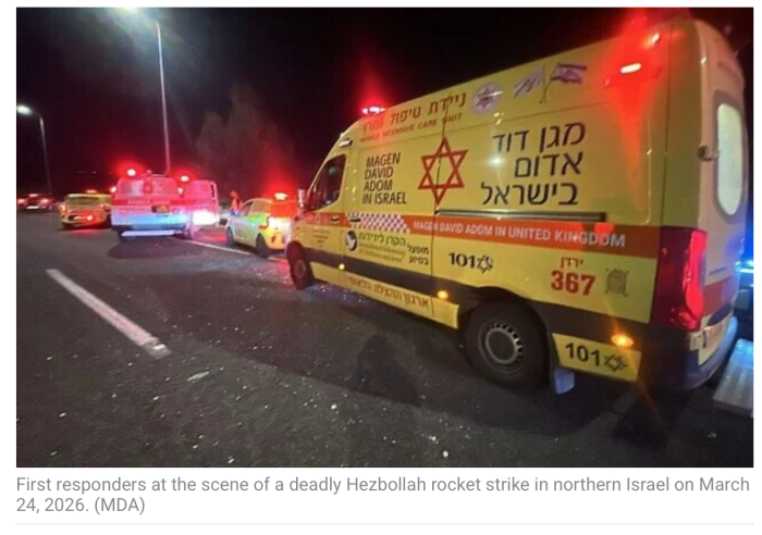 Durch den Einschlag einer Rakete an der Mahanayim Kreuzung im Norden Israels wurde eine 30-jährige Frau getötet. Im gleichen Angriff wurden zwei weitere Personen leicht verletzt und von Magen David Adom vor Ort behandelt. Die Hisbollah hatte etwa 30 Raketen gleichzeitig auf diese Region abgeschossen.