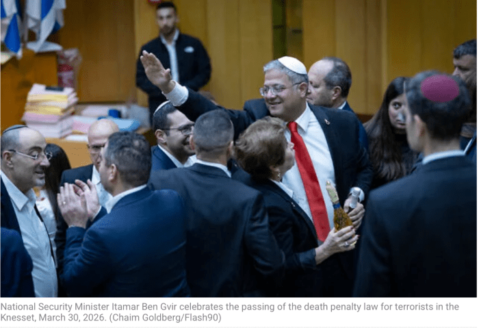 «Dies ist ein Tag der Gerechtigkeit für die Opfer und ein Tag der Abschreckung für unsere Feinde. Keine ‘Drehtür’ mehr für Terroristen, sondern eine klare Entscheidung. Wer sich für den Terrorismus entscheidet, entscheidet sich für den Tod.» Jubelte Ben Gvir, die rechte Hand zum Hitlergruss hochgereckt (gut, vielleicht hat der Fotograf auch nur im richtigen Moment den Knopf gedrückt, in der Linken die bereits offene Flasche Sekt, die ihm die Knesset-Ordner aber wegnahmen.