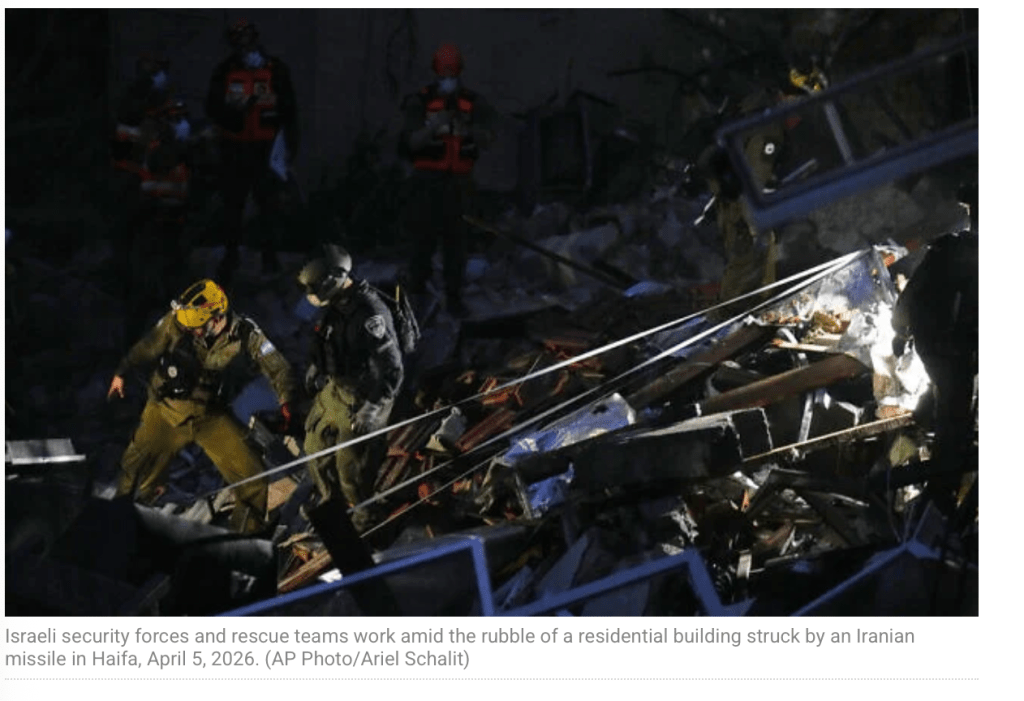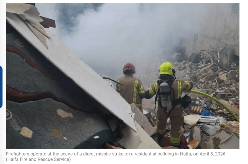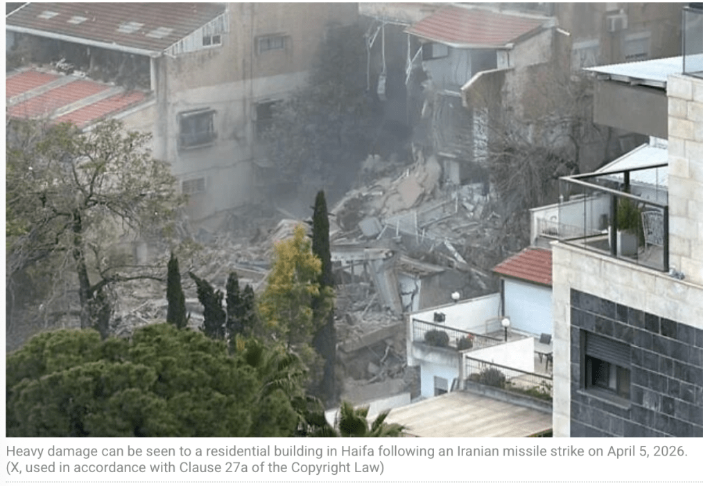 Gestern Nachmittag wurde ein mehrstöckiges Gebäude in Haifa direkt von einer Rakete aus dem Iran getroffen und drohte, zusammenzubrechen. Unmittelbar nach dem Einschlag brach ein Feuer aus. Vier Personen konnten von Feuerwehr- und Rettungsteams gerettet werden. Mit Scans wurde untersucht, ob sich unter den Trümmern eingeschlossene Personen befanden. Erste Untersuchungen ergaben, dass tatsächlich vier Personen verschüttet wurden. Man geht davon aus, dass der Sprengkopf der Raketen (noch) nicht explodiert ist. Um keine Leben zu gefährden, wurden benachbarte Häuser zwangsevakuiert. Bereits am Sonntag konnten zwei Personen tot geborgen werden. Am Montagnachmittag wurden zwei Personen, ein Mann in den 40er-Jahren und eine Frau, 35, s’’l, tot geborgen. Die Rettungsaktion dauerte insgesamt 18 Stunden. Vier Personen, darunter ein Baby im Alter von 10 Monaten, wurden verletzt. Die Rakete wurde nicht abgefangen, weil sie zuvor bereits in der Luft zerbrach. Ein Teil der Rakete, der den Sprengkopf trug, verursachte den Einschlag.