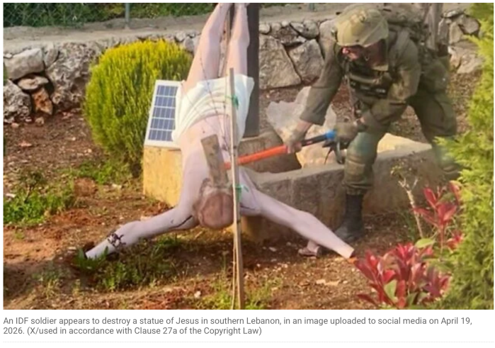 Die IDF konnte leider die Echtheit eines Bildes bestätigen, das gestern in den sozialen Medien hochgeladen wurde. Es zeigt einen IDF-Soldaten, der im südlichen Libanon eine lebensgrosse Jesus-Figur zertrümmert. IDF-Sprecher Nadav Shoshabi postete auf ‘X’: «Es gilt als sicher, dass das Bild einen IDF-Soldaten zeigt, der im südlichen Libanon eingesetzt ist. Die IDF untersucht diesen Vorfall sehr scharf. Wir betonen, dass er völlig den Werten, die zu verfolgen unsere Truppen angehalten sind, widerspricht.» Gegen den Verursacher werden ‘angemessene’ Massnahmen ergriffen. Auch Aussenminister Gideon Sa’ar und Netanyahu verurteilten den Vorfall als ‘beschämende Aktion’ und entschuldigten sich bei der christlichen Gemeinde Debel im Südlibanon. Die Identität des Soldaten wurde mittlerweile bestätigt.