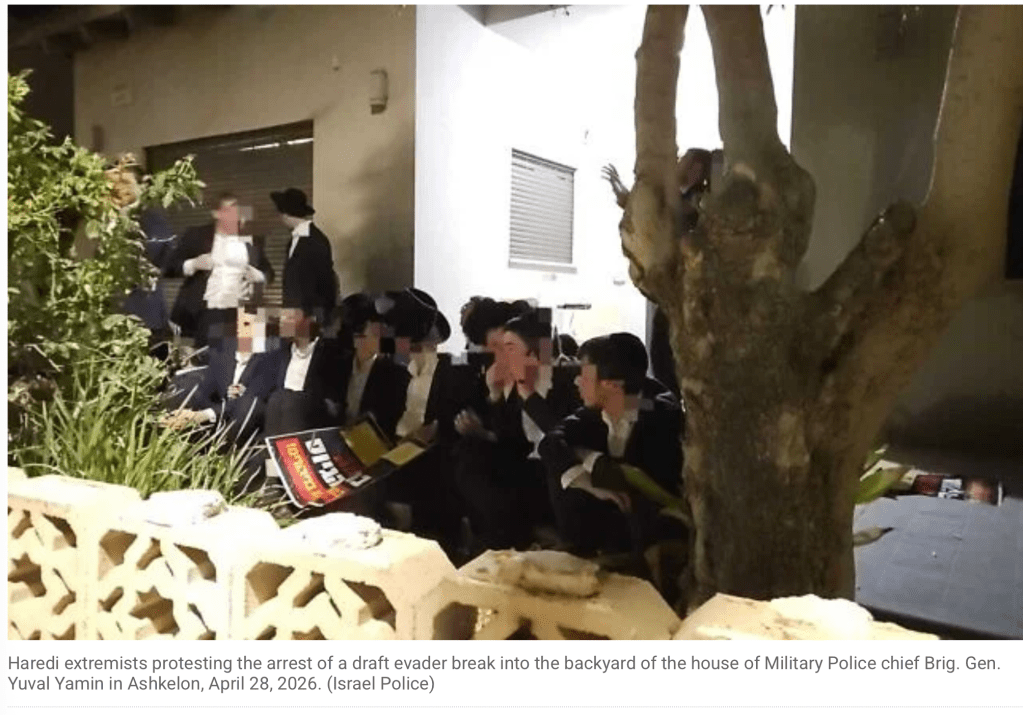 Vorgestern Abend betraten einige Dutzend haredische Extremisten das Grundstück von Militärpolizei-Chef Yuval Yamin in Ashkelon durch das offene Gartentor. Zuvor hatten sie an einer Demonstration gegen die Festnahme von Wehrdienstverweigerern vor dem Haus teilgenommen. Netanyahu und VM Katz verurteilten den Vorfall und forderten, dass «gegen die Gruppe von gewalttätigen Kriminellen mit der ganzen Härte des Gesetzes vorgegangen werden muss.» Der Vorfall fand statt, während sich angeblich die gesamte Familie im Haus befand. Anderen Berichten zufolge war die Familie nicht anwesend. Wieder andere Medien behaupten, die Familie sei evakuiert worden. Generalstabschef Zamir verurteilte den Vorfall ebenfalls: «Angriffe auf Sicherheitskräfte und ihre Familien stellen das Überschreiten einer gefährlichen roten Linie dar», betonte Zamir. «Dies ist ein schwerwiegender Vorfall, und alle Strafverfolgungs- und Sicherheitsbehörden müssen entschlossen handeln, um die Beteiligten vor Gericht zu bringen.» Die Polizei nahm 25 Demonstranten vorübergehend fest, aber nur 12 wurden zur Befragung mitgenommen. Der OGH forderte die Regierung auf, sofort alle Zahlungen an Haredim einzustellen, die sich nicht umgehend zum Militärdienst melden.