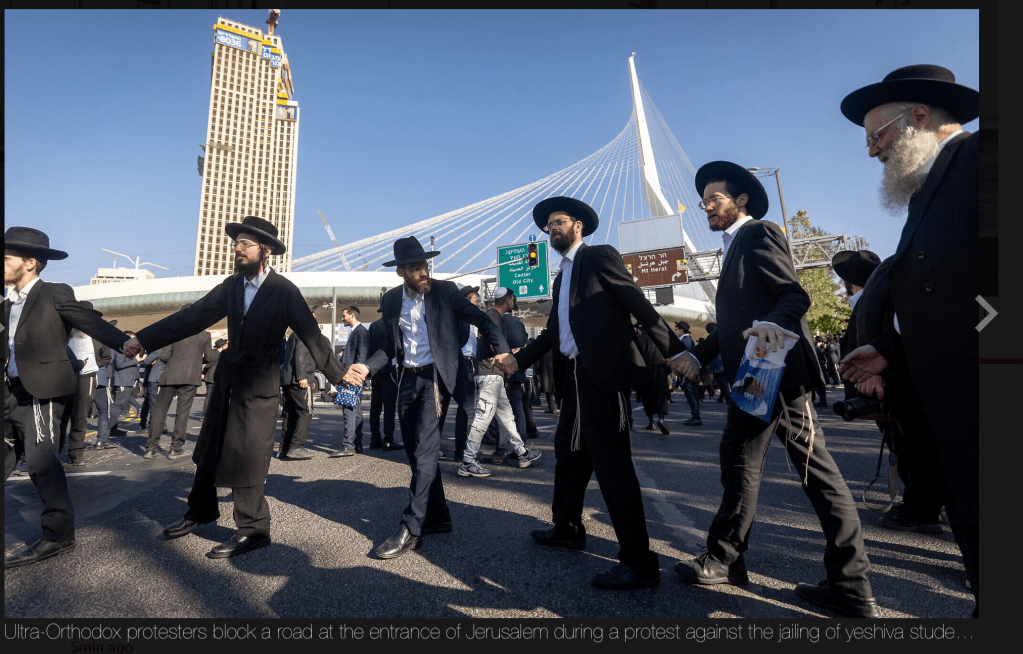 Ultraorthodoxe Mitglieder der extremen ‘Jerusalem Fraktion’ blockierten gestern die Schnellstrasse Nr 4, die als wichtigste Nord-Süd-Verbindung durch Bnei Brak, einer Hochburg der Ultraorthodoxen führt. Die Demonstration richtete sich gegen die Festnahme von Yeshiva-Studenten, die sich der Wehrpflicht entzogen hatten. «Wir ziehen es vor, als Haredim zu sterben, anstatt als IDF-Soldaten zu leben», lautet der Slogan, der seit Monaten ihre Demonstrationen begleitet. Der geistliche Führer der etwa 60.000 Mann umfassenden Fraktion Rabbi Azriel Auerbach erklärt: «Jeder, der nicht hinausgeht, um gegen die Festnahme eines Yeshiva-Studenten aus dem Inneren des Studienraums zu protestieren, beteiligt sich an der Verfolgung derer, die die Torah studieren. Es ist eine absolute Pflicht für jeden, der die Torah und den Namen des Himmels schätzt, gegen deren Herabwürdigung und Entweihung zu protestieren.» Der gute Mann ist im Unrecht! Pflicht ist es in der IDF zu dienen!